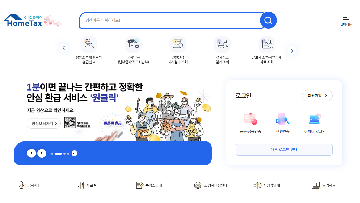 5년 치 환급금 한 번에 신청가능합니다. 복잡한 절차 없이 클릭 한 번으로 종합소득세 환급을 받을 수 있는 원클릭 서비스가 개통되었습니다. 신청 과정이 간편해 시간을 아낄 수 있으며, 민간 세무 대행 서비스와 달리 수수료가 없어 환급금을 온전히 받을 수 있습니다. 지금 바로 홈택스에 접속해 환급 대상 여부를 확인하고 신청해 보세요.