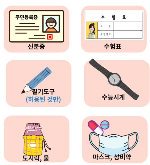 신분증, 수험표, 검은색 컴퓨터용 사인펜, 흰색 수정테이프, 흑색 연필, 지우개, 샤프심(흑색, 0.5mm), 아날로그 시계 (통신, 결제 기능 및 전자화면이 없는 시계), 마스크(감독관 사전 확인)