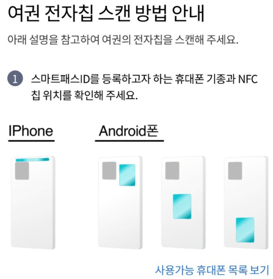 5. 아이폰은 최상단, 안드로이드는 휴대폰 뒤 중앙 위치에서 스캔합니다. 여권 전자칩 인식이 잘 안될 경우, 전자 여권칩 스캔 방법 자세히 보기를 클릭하여 확인합니다.
