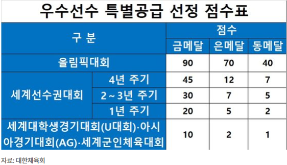 1983년 아시안게임(1986년)과 올림픽(1988년) 개최가 확정된 후, 선수들의 사기를 높이기 위해 특별공급 대상에 올림픽대회와 세계선수권대회에서 3위 이상에 입상한 선수들을 포함시켰습니다. 올림픽 금메달리스트는 신혼부부, 생애 최초 주택 구매자, 다자녀 가구, 노부모 부양 가구 외에도 ‘기타’ 항목(기관 추천)으로 특별공급 혜택을 받을 수 있습니다.
