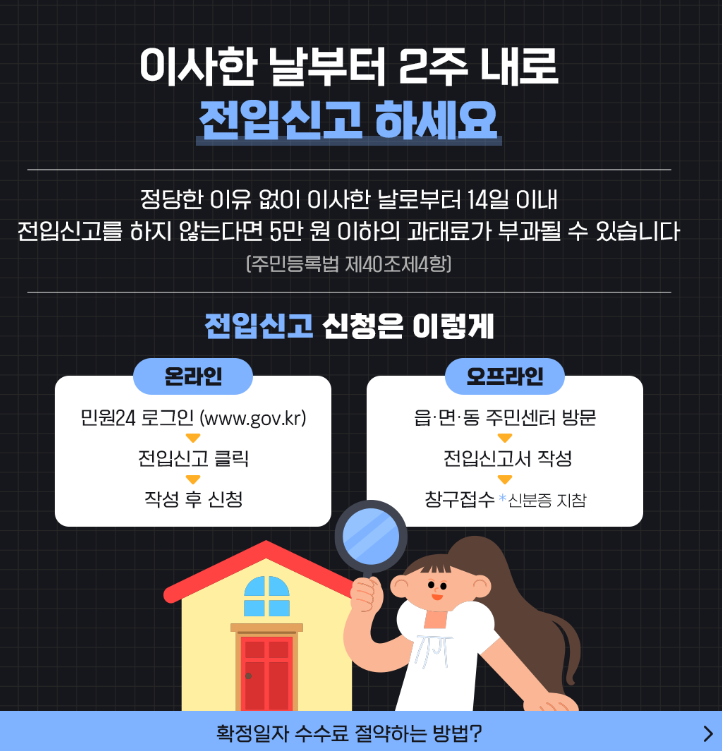 이사 후 14일 이내에 전입신고를 하지 않으면 5만 원 이하의 과태료가 부과될 수 있습니다.