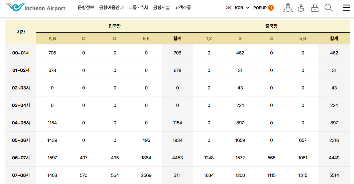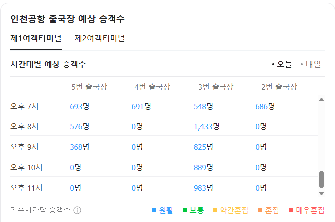 인천국제공항의 공식 홈페이지에서는 출국장, 보안검색대 혼잡도를 실시간으로 제공합니다. 터미널 별로 구분되어 혼잡 / 보통 / 여유 등으로 확인할 수 있습니다.