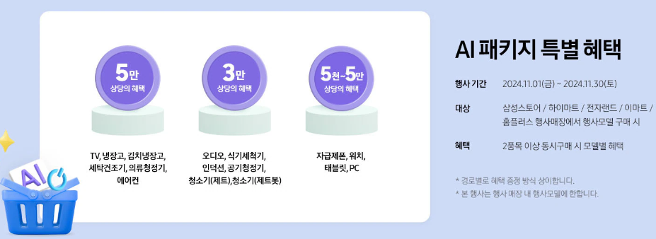 삼성전자의 똑똑한 AI 가전제품을 구매하고 싶다면, AI 패키지를 활용해 보세요. AI 냉장고, AI 세탁기 등 다양한 AI 제품을 함께 구매하면 추가 할인 혜택을 받을 수 있습니다. 스마트한 라이프를 위한 첫걸음을 더욱 저렴하게 시작할 수 있는 기회입니다.