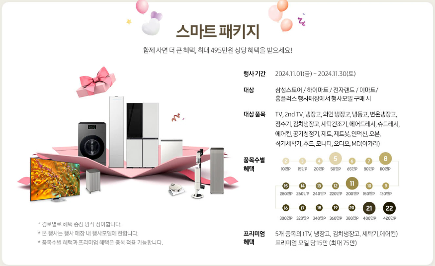 여러 제품을 한꺼번에 구매하는 경우, 더 큰 할인 혜택을 받을 수 있습니다. 바로 스마트 패키지는 TV, 냉장고, 세탁기 등 다양한 제품을 패키지로 구성하여 할인된 가격에 제공하는 상품입니다. 이사나 혼수를 준비하는 분들에게 특히 유용한 혜택이 니입니다.
