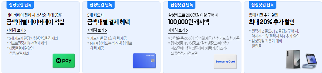 삼성전자는 다양한 카드사와 제휴하여 추가 할인 혜택을 제공합니다. 특정 카드로 결제 시 추가 할인은 물론, 무이자 할부 혜택까지 가능합니다. 코리아 세일 페스타 기간에는 더욱 다양한 카드사와의 제휴가 진행될 예정이니, 평소 사용하는 카드의 혜택을 미리 체크해 두는 것이 좋습니다.