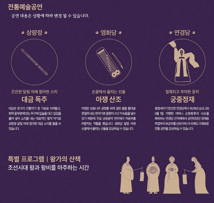 | 문의 | 예매문의 : 티켓링크 고객센터 1588-7890 행사문의 : 궁능활용프로그램 콜센터 1522-2295 |