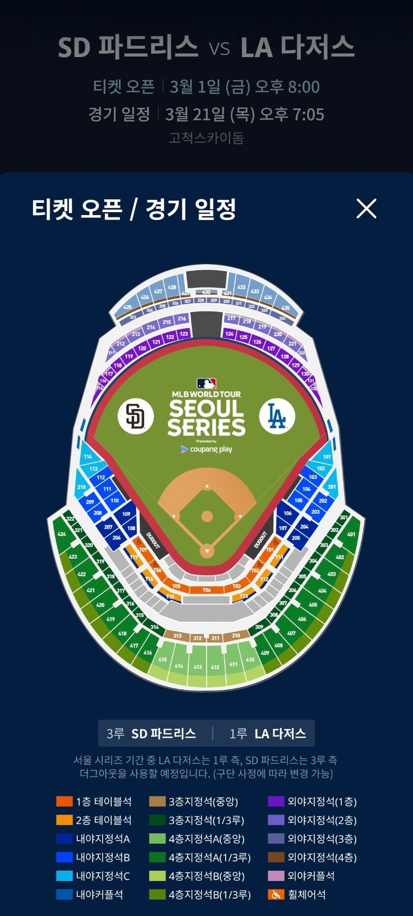 서울 시리즈 경기는 위와 같은 가격으로 판매되며 (LA 다저스 vs SD 파드리스) 한국 구단과 하는 친선경기는 50% DC 된 가격이 적용되어 판매됩니다. 참고하세요