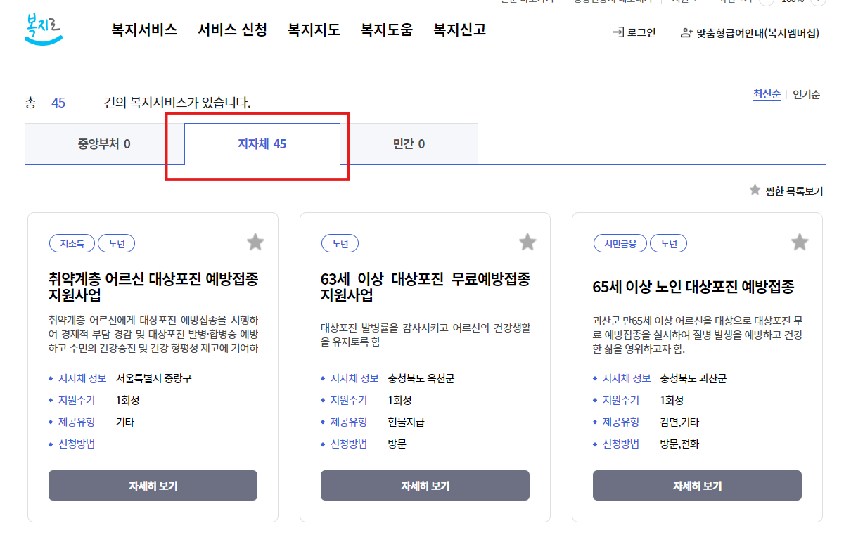 ● 지자체 탭으로 이동하면 44개 항목이 현제 검색되고 있습니다. (지자체 총개수가 다르게 표시될 수 있습니다)