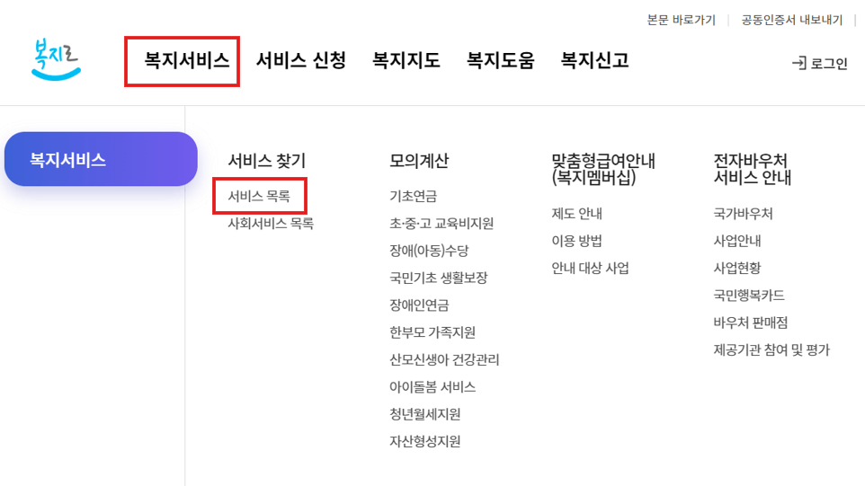 ● 상단 메뉴 "복지로서비스 > 서비스 목록" 이동합니다.