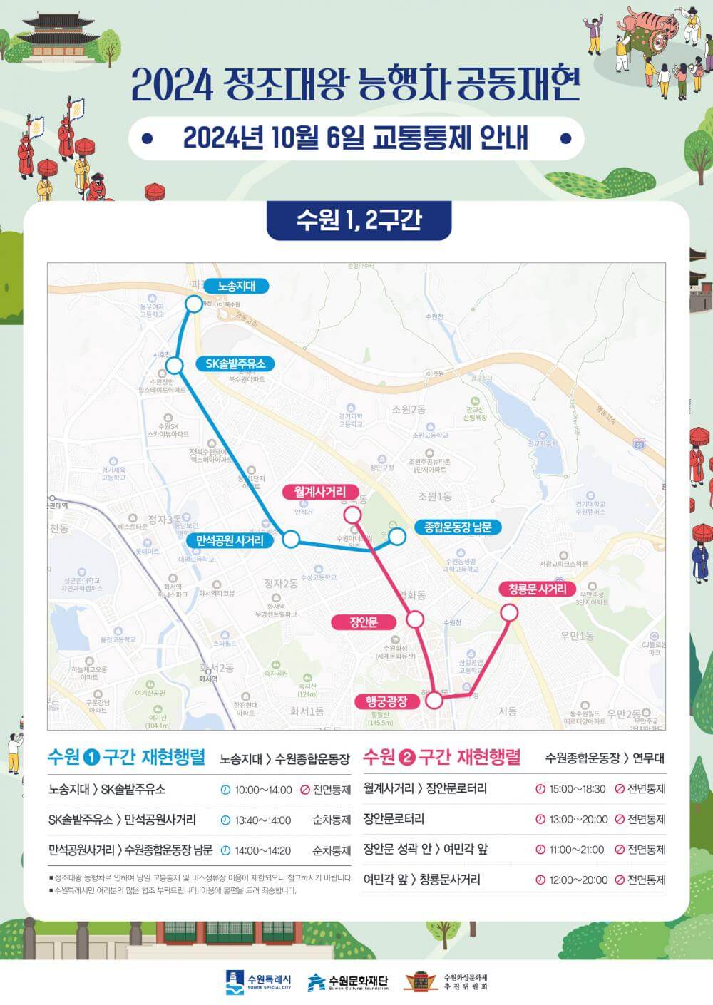 2024년 10월 6일 수원 정조대왕 능행차 공동재현 행사가 열립니다. 이 행사는 정조대왕의 역사적 행차를 재현하며, 많은 시민과 관광객들이 참여할 예정입니다. 하지만 행사 당일에는 교통 통제가 예정되어 있어, 방문객들은 미리 교통 상황을 확인하는 것이 중요합니다.
