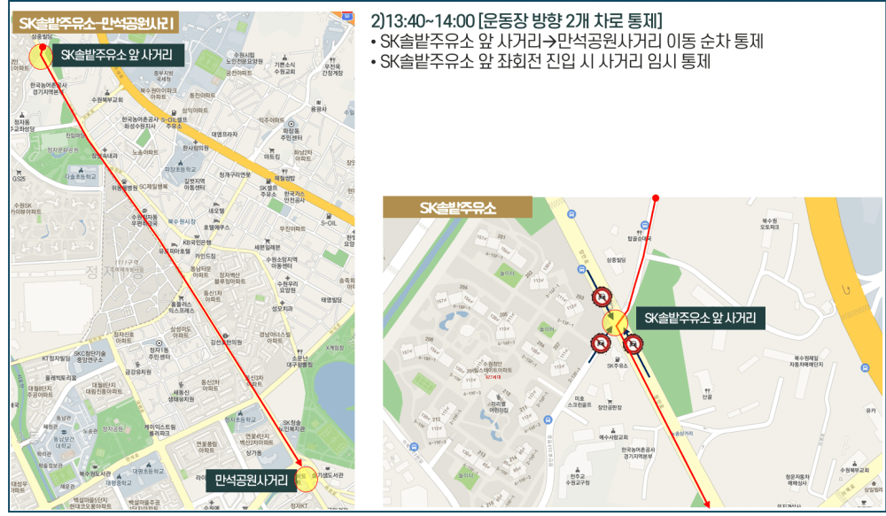 | 2 | SK솔밭주유소 앞 ~ 만석공원 사거리 | 13:40~14:00 | 종합운동장 방면 2개 차로 통제 |