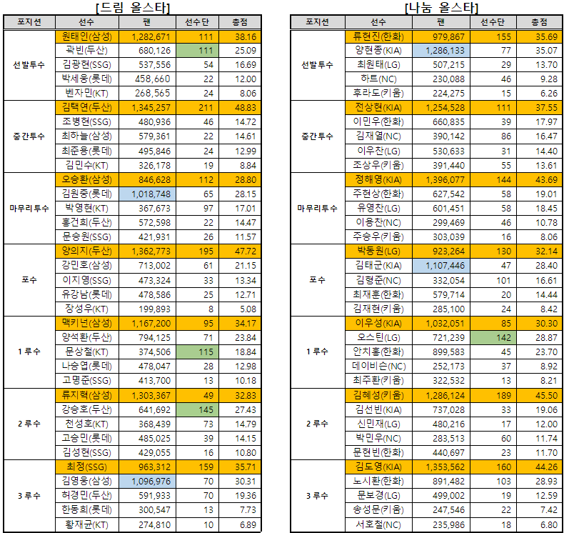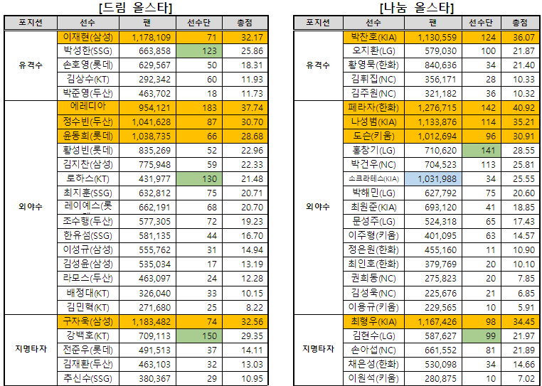 | 외야수 | 에레디아(SSG) 정수빈(두산) 윤동희(롯데) |