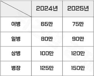 병장: 1,250,000원에서 1,500,000원으로 약 20% 인상