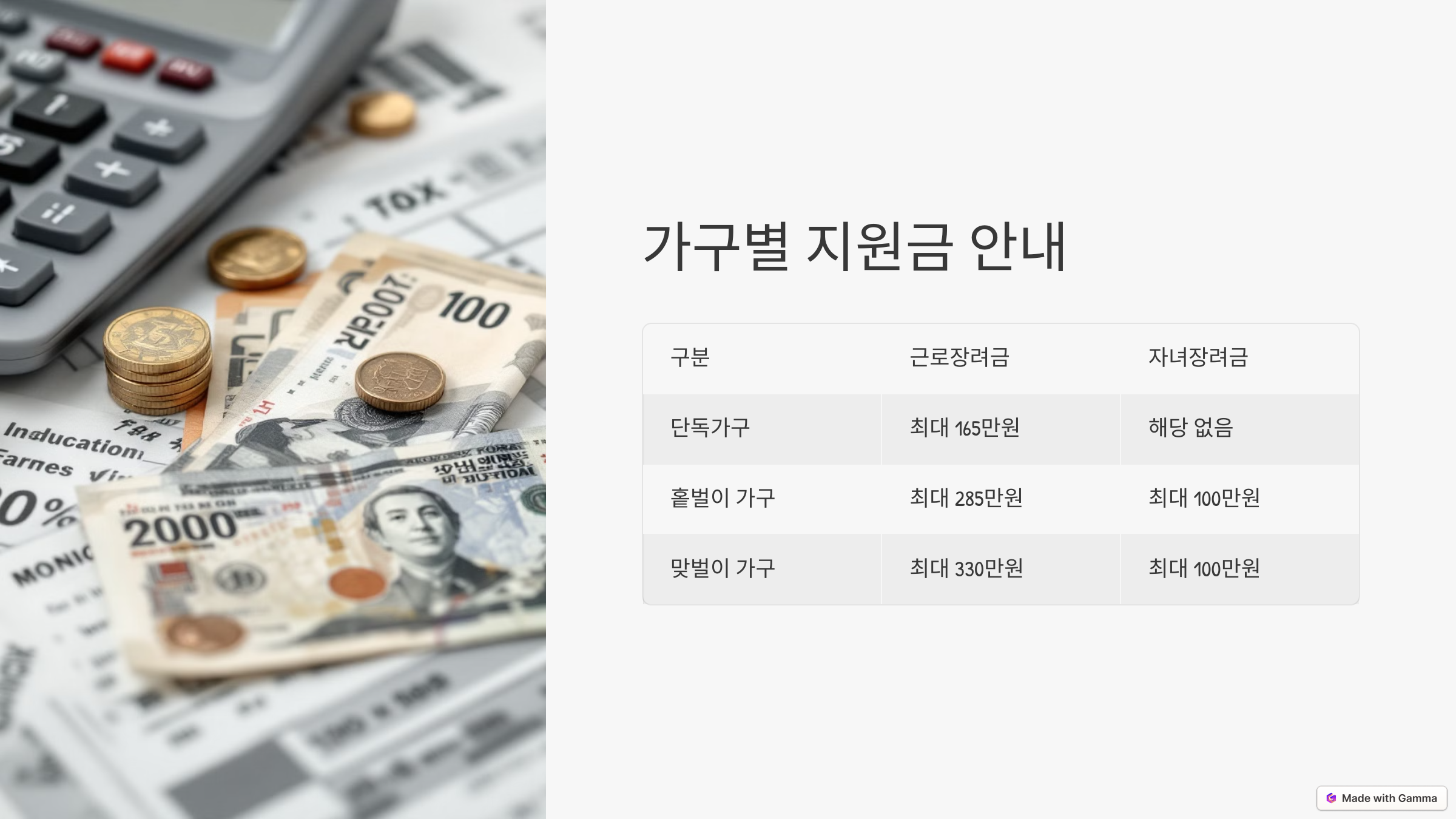 | 홑벌이 가구 | 최대 285만원 | 최대 100만원 |