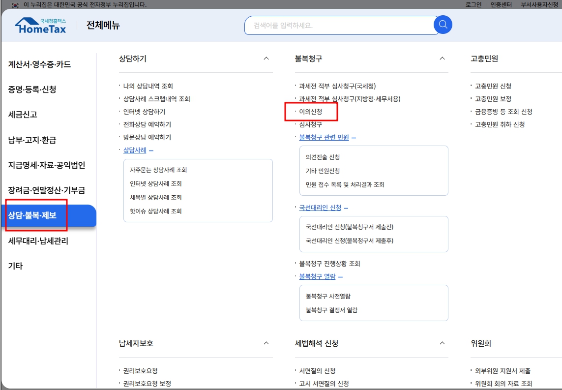 - '전체' → ' 상담,불복,제보 ' → '이의신청' 선택