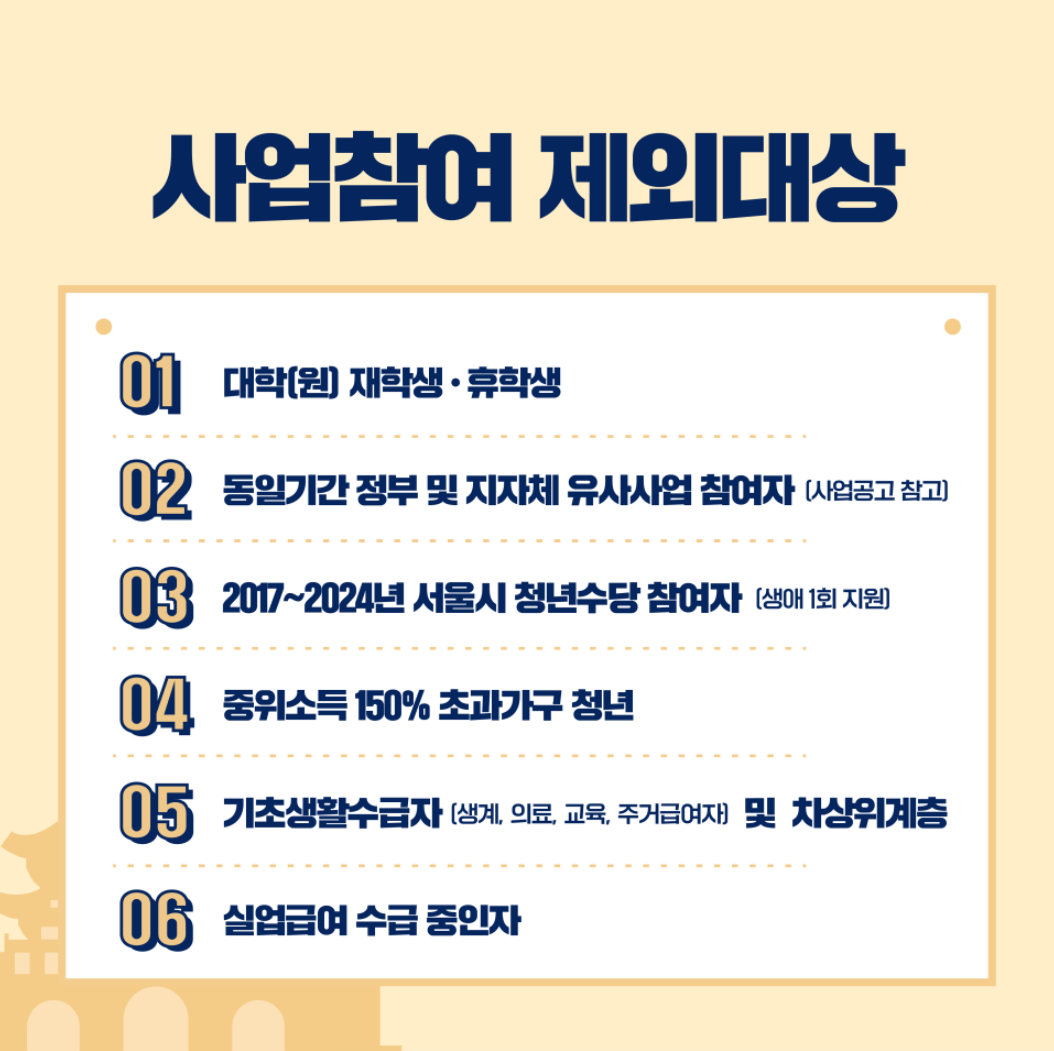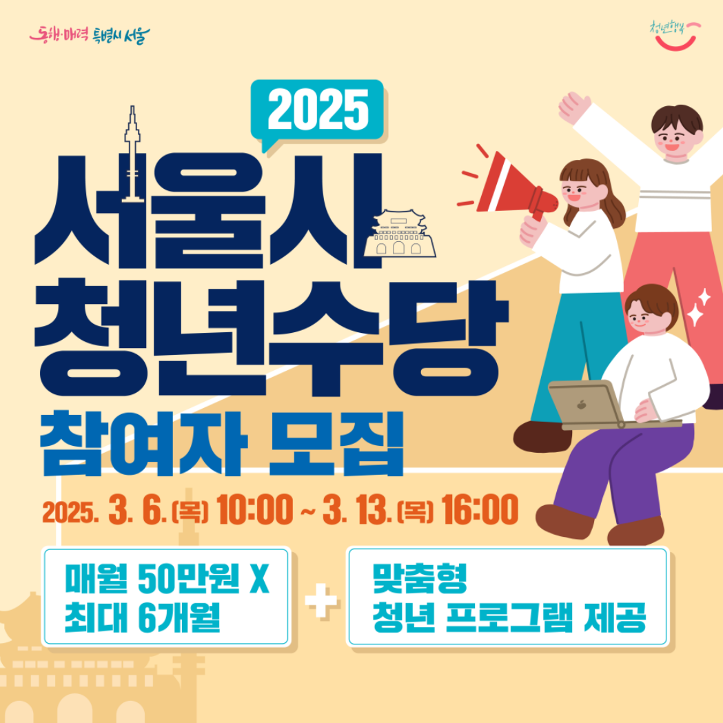 청년들의 경제적 부담이 날로 커지는 현실 속에서, 서울시 청년수당은 미래를 준비하는 청년들에게 중요한 지원책으로 청년수당을 놓치면 소중한 기회를 잃게 됩니다. 매월 50만 원씩 최대 6개월간 지원받을 수 있는 이 기회, 신청하지 않으면 지원을 받을 수 없는 제도 입니다.