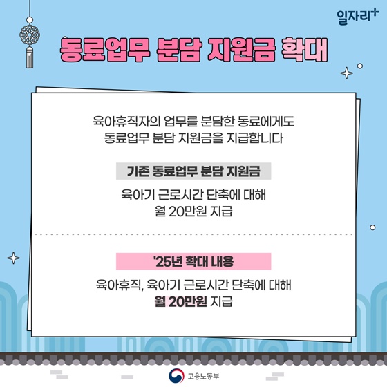 육아휴직자의 업무를 분담한 동료에게 지급되는 지원금도 확대됩니다. 이전에는 육아기 근로시간 단축에 대해서만 월 20만 원이 지급되었지만, 2025년부터는 육아휴직까지 포함하여 월 20만 원이 지급됩니다.