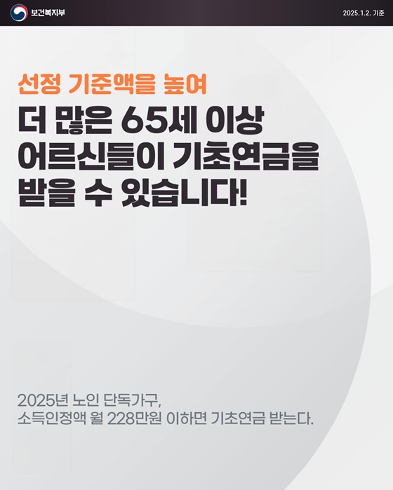 2025년 기초연금 선정기준액이 인상되었습니다. (2024년 대비 7% 인상된 금액)