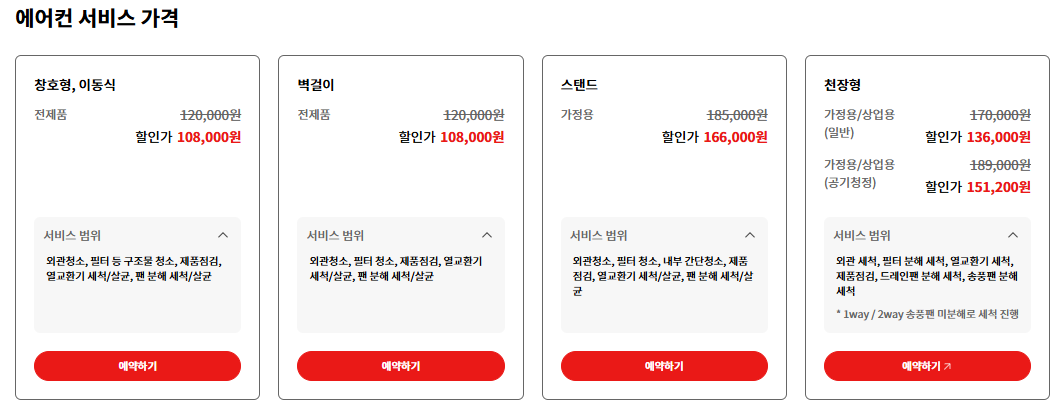 | 에어컨 종류 | 대상 제품 | 정가 | 할인가 | 소요 시간 (평균) |